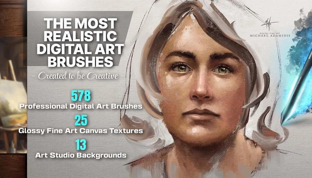 578 Premium Digital Art Brushes - 25 Glossy Fine Art Canvas Textures - 13 Art Studio Backgrounds